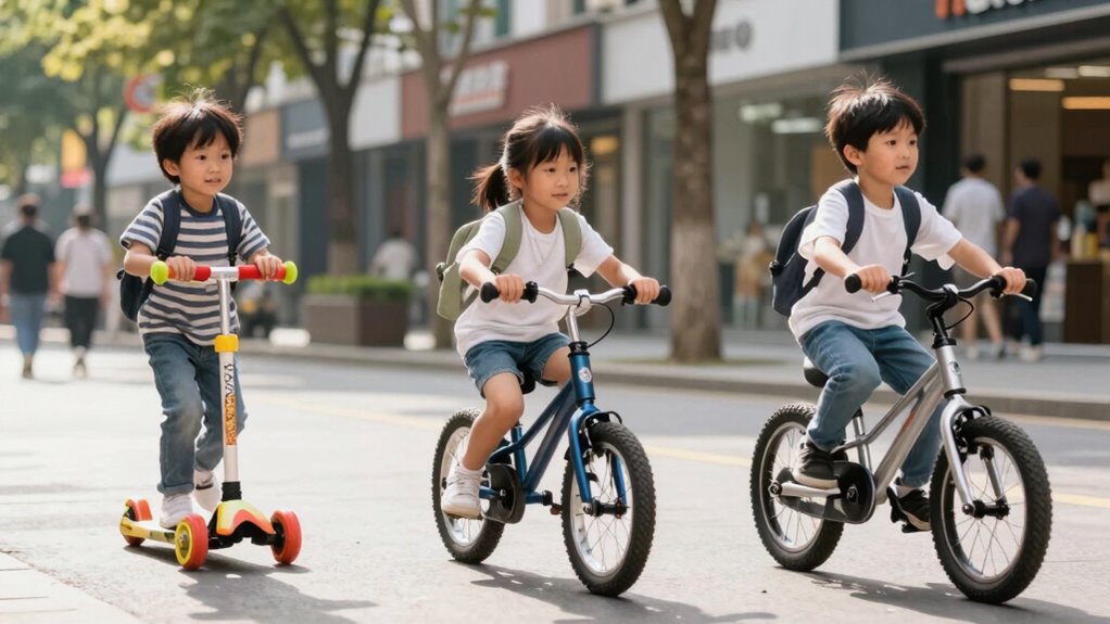 You can start scooter or bike lessons when your child’s ready to master balance exercises and hand-eye coordination, typically around ages 3 to 6. Picture a tiny acrobat wobbling on a scooter, then confidently gliding—this is the ideal age range to introduce lessons. Early practice builds skills, confidence, and coordination, turning chaos into fun and helping them conquer the motor skill ladder with ease.