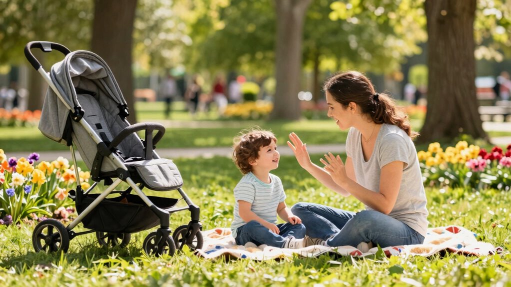 During your stroller walks, point out interesting details in nature to keep your child’s curiosity alive. Narrate your surroundings to help them connect words with what they see and experience. These simple responses foster engagement and support their developing brain. Incorporating learning opportunities like identifying different trees or insects can further enhance their understanding and curiosity. Recognizing signs of connection, such as shared attention or emotional responses, can also help children develop social awareness and empathy during these outdoor interactions. Noticing how your child’s attention span responds to various stimuli can also guide you in fostering their focus and curiosity. Observing environmental cues can provide additional insights into your child’s interests and reactions, helping you tailor your responses more effectively. Additionally, understanding personality traits can help tailor your responses to better support your child’s unique social and emotional development.