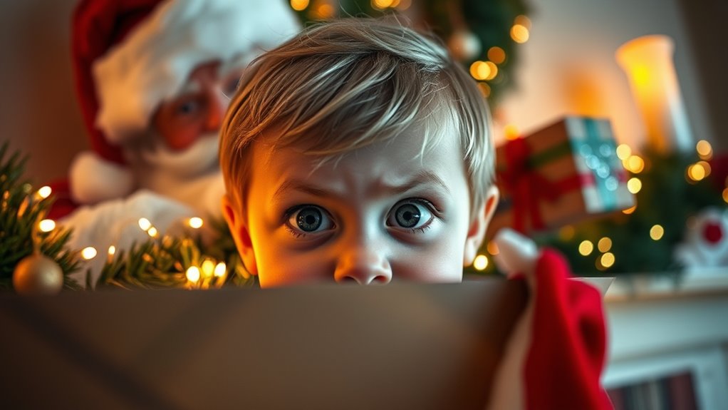 When kids show Santa skepticism, you should stay calm and listen. Instead of dismissing their doubts, gently explore their feelings and questions. You can reinforce the myth by sharing fun stories or emphasizing the magic of Santa, helping them see it as a joyful tradition. If they persist, reassure them that believing is okay, and that the spirit of giving and kindness is what truly matters, fostering positive myth reinforcement.
