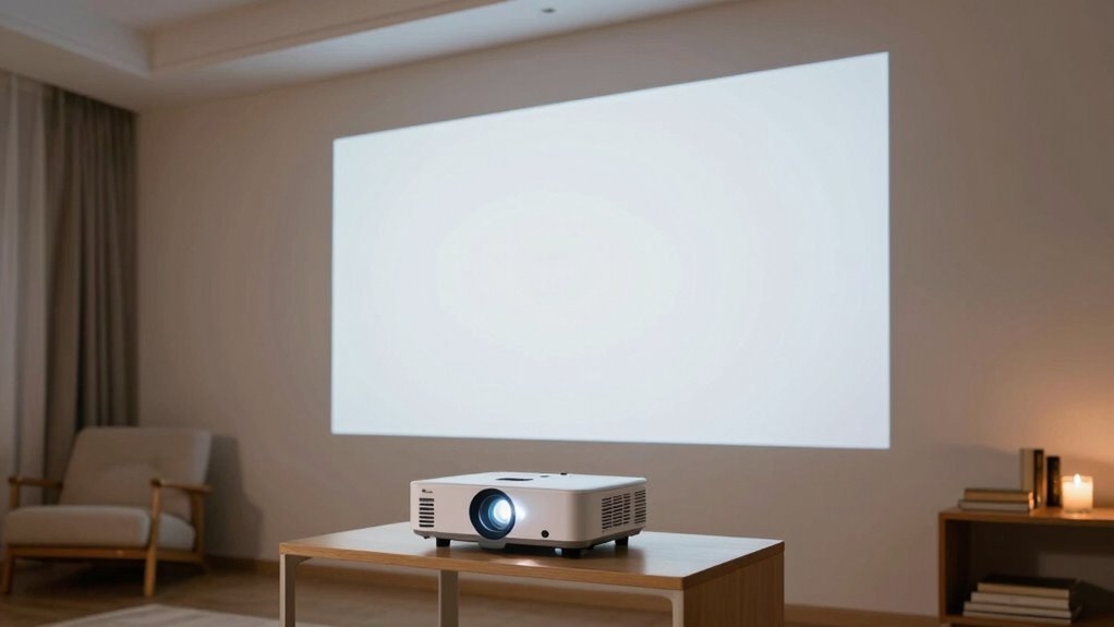 To reduce eye strain when using a projector, start by adjusting the brightness to comfortable levels. Make sure you’re sitting at the right distance from the screen to avoid unnecessary eye effort. Remember to take regular breaks to give your eyes a rest and prevent fatigue. Additionally, selecting a suitable screen environment can further minimize eye discomfort during prolonged use. Incorporating home soundproofing techniques can also help create a more comfortable viewing space by reducing ambient noise distractions. Maintaining proper lighting conditions in your viewing area can further enhance visual comfort and reduce eye strain during extended sessions. Being mindful of indoor air quality can also contribute to overall comfort, as poor air quality may cause additional eye irritation over time. Ensuring good humidity control in your indoor space helps maintain comfortable conditions that support overall eye health and reduce dryness.