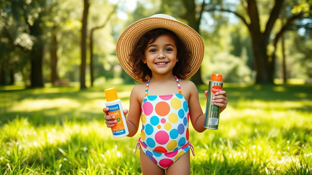 Remember, when it comes to protecting your kids, sunscreen and bug spray are your shields against outdoor dangers. Think of them as armor that keeps pesky bugs and harmful rays at bay, allowing your little ones to enjoy the sunshine safely. Always follow the directions, apply generously, and reapply as needed. With these simple steps, you can turn outdoor adventures into worry-free memories—like a protective parachute guiding your kids safely through every sunny day.