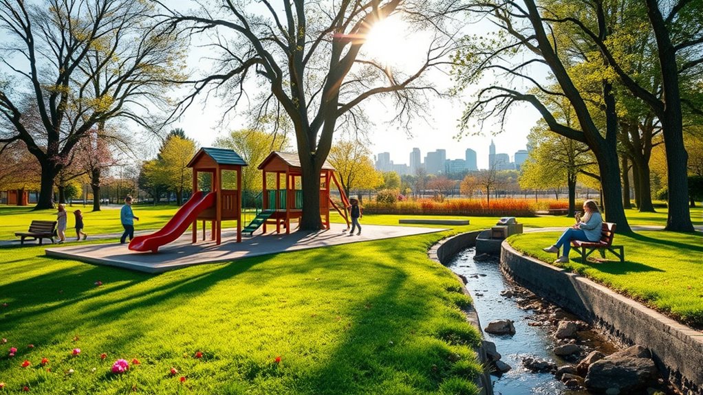 Looking for the best parks and playgrounds in your city tailored for new moms? Choose spots with looped trails for relaxed walks without complex navigation, perfect for pushing strollers or strolling at your own pace. Safe play areas with natural materials and protective features like hydrocolloid help keep children secure and comfortable during active fun. Shaded resting spots and accessible paths make the outdoor experience even more enjoyable. Keep exploring to discover more family-friendly parks that suit your needs.