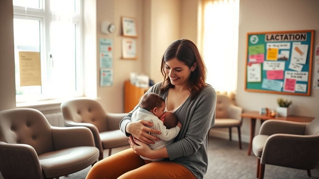 Finding lactation support near you is easier than ever with organizations like La Leche League, WIC programs, and local clinics. They offer expert advice, in-person or virtual consultations, and community support to help you succeed. Whether you need assistance with latch techniques, storage tips, or troubleshooting, these resources are there for you. Keep exploring to discover how these options can make your breastfeeding journey more confident and comfortable.