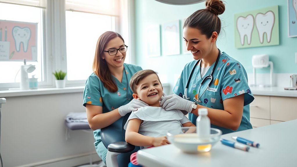 Starting your child’s dental visits early helps set healthy habits, making future visits less stressful. Regular checkups let your dentist monitor development, spot issues early, and give tailored advice. Fluoride treatments, when used properly, strengthen teeth and prevent cavities safely. Your dentist will evaluate fluoride needs based on your child’s age and risk factors. For more tips on ensuring a positive dental experience and safe fluoride use, keep exploring how these strategies protect your child’s smile.