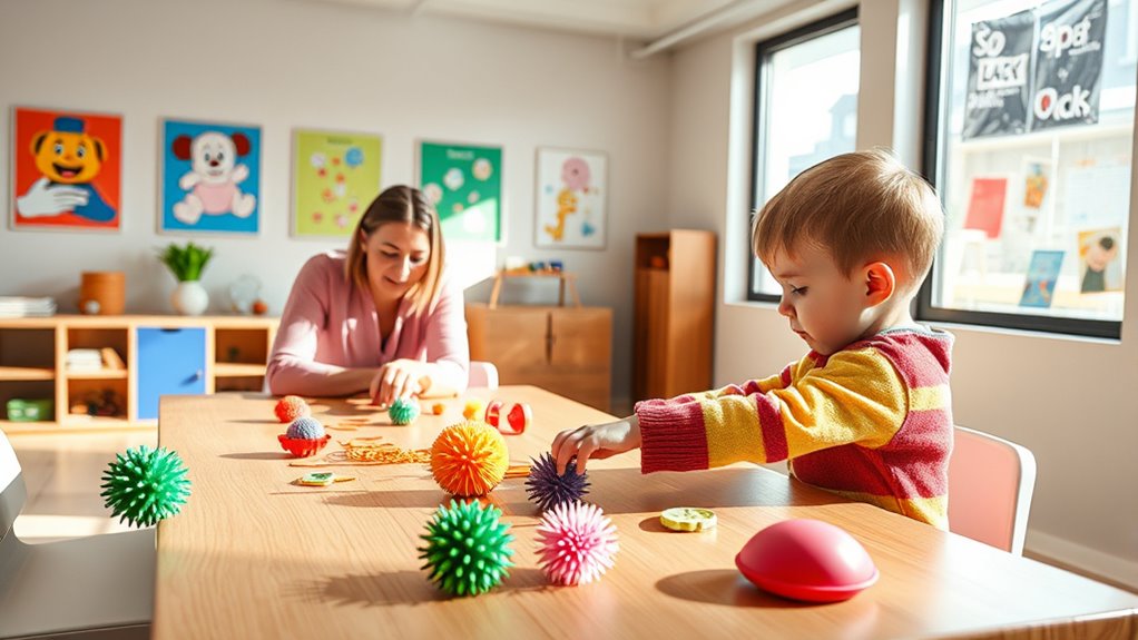 An occupational therapist helps you understand and manage sensory processing differences by evaluating your sensitivities and developing personalized strategies. They guide you through creating a sensory diet, which includes activities like squeezing stress balls or deep-pressure techniques to regulate your system. Modifications such as soft clothing or weighted blankets can also support your comfort. If you want to discover how these approaches can improve your daily life and well-being, you’ll find helpful insights ahead.
