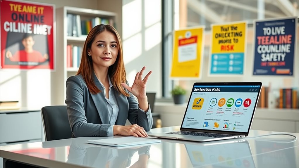 As a parent or guardian, it’s important to set clear digital boundaries that guide your teen’s online behavior without feeling controlling. Use monitoring tools thoughtfully and foster open communication, so your teen feels safe sharing concerns. Educate them about sextortion risks and privacy, emphasizing caution with personal info and images. Regularly update safety plans to adapt to new tech. Keep these strategies in mind, and you’ll discover ways to create a safer digital environment for your teen.