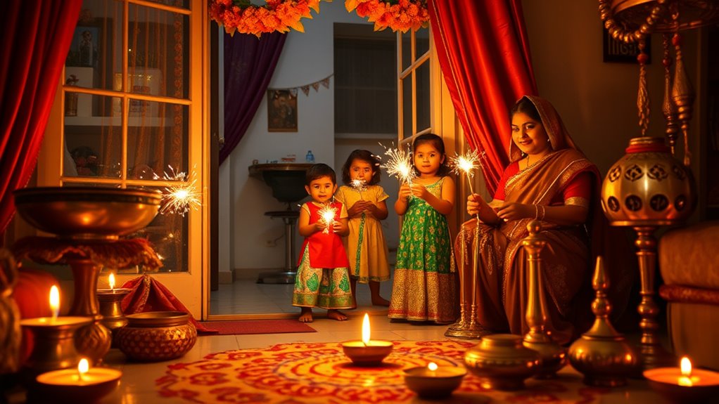During Diwali at home, you and your family come together to light lamps and decorate with colorful rangoli, creating a warm and inviting atmosphere. You prepare traditional sweets, often with children helping in the kitchen, and participate in rituals that honor light and gratitude. These customs strengthen family bonds, celebrate cultural heritage, and spread positivity. If you want to know more about how to create memorable Diwali traditions, keep exploring these joyful practices.