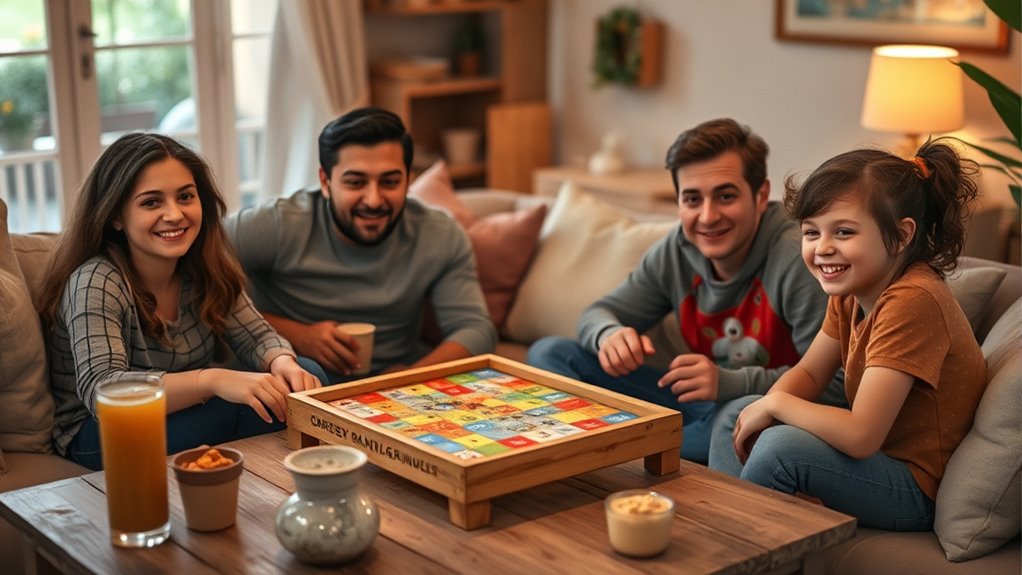 Finally, remember that the goal is to have fun and bond. Celebrate each other’s victories, and don’t be afraid to laugh at mistakes. Encourage good sportsmanship by praising effort and emphasizing that winning isn’t everything. When everyone plays by the rules, shares strategies, and respects each other’s turns, family game night becomes a cherished tradition. By focusing on team strategies, offering game variety, and maintaining fairness, you’ll create a lively, inclusive atmosphere where everyone looks forward to the next gathering.