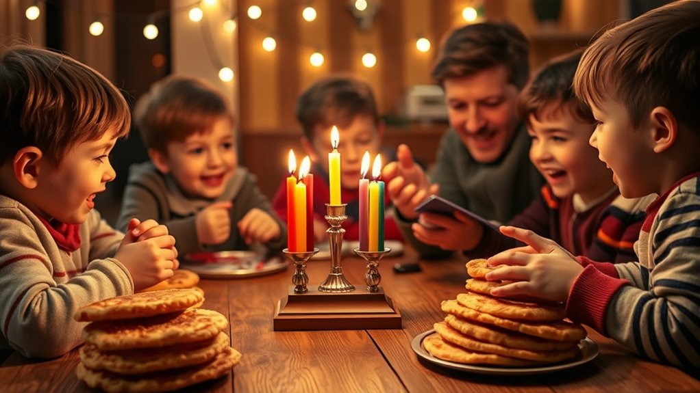 Imagine Hanukkah as a tiny boat sailing through a sea of lights, where your young kids are brave explorers. For their age, you can choose stories like “The Little Dreidel,” which highlights the joy of playing Dreidel games, or fun rhymes with familiar Hanukkah songs that teach about the holiday’s meaning. These stories and songs make learning about Hanukkah exciting and easy for young children to grasp.