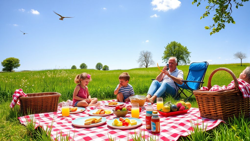 Ultimately, a successful family picnic hinges on thoughtful planning and attention to outdoor safety. When you plan your meal carefully, you guarantee everyone is well-fed and satisfied, which keeps spirits high. Meanwhile, prioritizing outdoor safety means everyone stays comfortable and secure, so you can focus on having fun. Bring along some outdoor games or a frisbee to add a bit of activity, but always keep an eye on your surroundings. By balancing excellent meal planning with a focus on outdoor safety, you create an environment where stress melts away, replaced by laughter, connection, and the simple pleasure of enjoying nature together. With a little preparation, your family picnic will be smooth, safe, and memorable—just the way it should be.