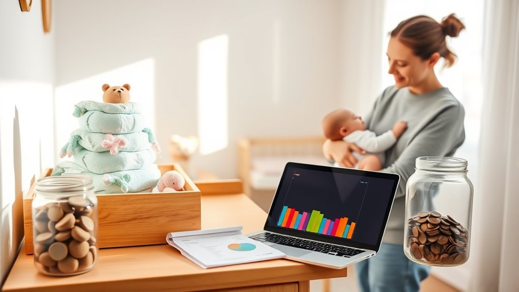 As a new parent, start by tracking your expenses and creating a realistic budget that covers essentials like childcare, supplies, and healthcare. Look for ways to cut costs, such as buying secondhand, DIY solutions, or sharing childcare duties. Automate savings for future needs and stay flexible to adapt to changing family needs. Managing your finances carefully now helps you balance ongoing expenses with saving for your child’s future. To find out more, discover practical tips to keep your family financially secure.