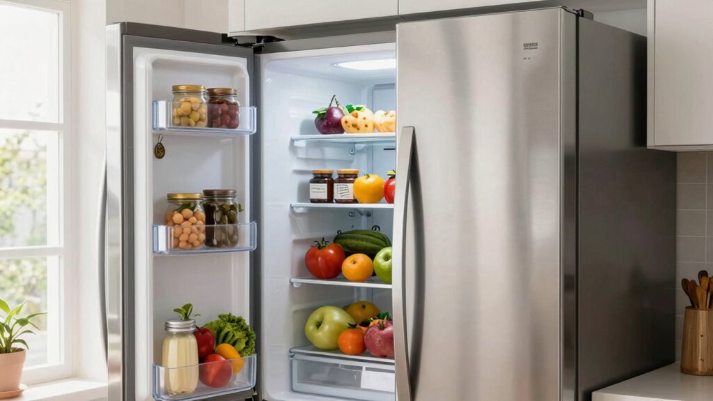 Your fridge’s noise level can skyrocket like a rocket ship when it’s full. When you pack it with food, the compressor works harder to maintain proper temperature, increasing sound output. Proper food placement helps distribute airflow evenly, reducing strain on the compressor and lowering noise. Keep the fridge organized and avoid overstuffing it, so it runs efficiently and stays quieter, making your kitchen a peaceful oasis.