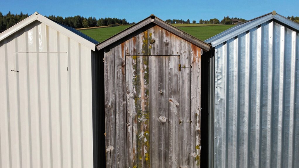 Choosing the right shed material is essential if you want something that can withstand harsh weather conditions and last for years. When comparing resin, wood, and metal, material strength and durability are key factors. Metal sheds often excel in structural integrity, providing resistance to warping and cracking. Resin sheds are lightweight yet resistant to corrosion, making them durable in wet climates. Wood sheds, while sturdy, may require treatment to prevent rot and insect damage. Additionally, material properties influence how well each material withstands environmental stressors over time, which is crucial for long-term durability and weather resistance. Here’s how they compare:
