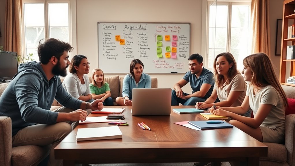 To run family meetings that work, set a clear agenda that covers topics like conflicts, chores, and goals. Assign roles such as note-taker or timekeeper to keep things organized and guarantee everyone stays involved. Follow up regularly on previous discussions and progress, making adjustments as needed. Consistent meetings create a safe space for communication and help build stronger connections. Keep exploring, and you’ll discover more effective strategies to make your family meetings successful.