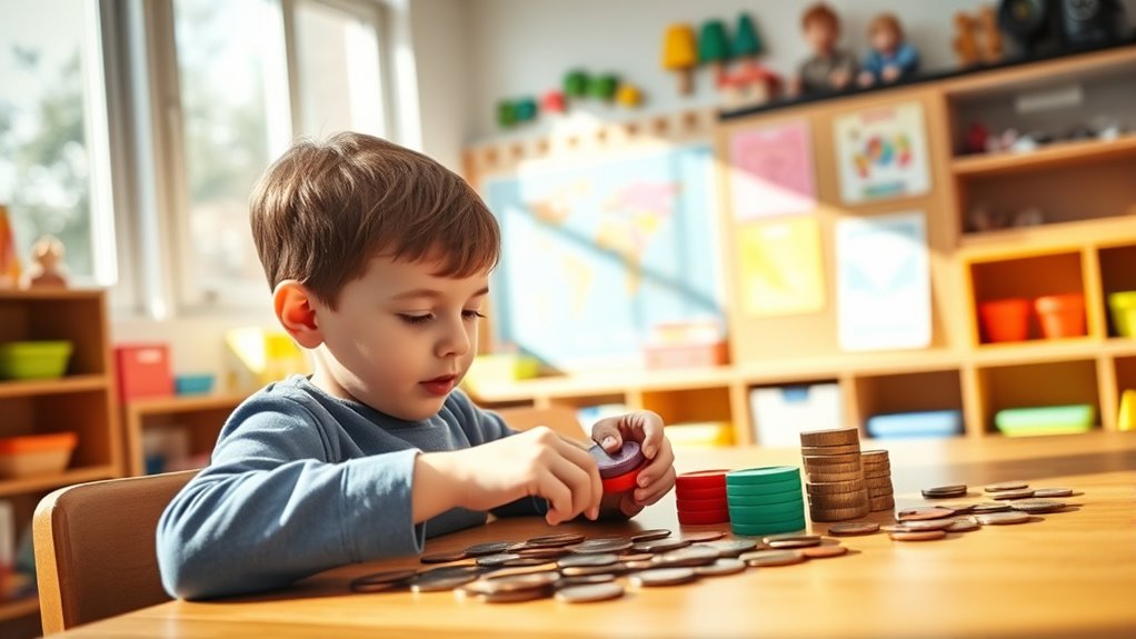 To teach your toddler about money, start with simple money games that make learning fun. Use piggy bank strategies to help them understand saving and spending. Encourage them to sort coins, count small amounts, or pretend to buy toys, making money concepts relatable. Keep lessons short and engaging, praising their efforts. This hands-on approach helps your toddler develop basic money skills while having fun and building confidence.