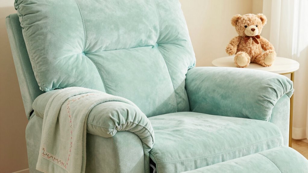 Want to turn your nursery recliner into a throne of comfort? Add pillow support for those long nursing nights and a cozy footstool to elevate your feet—because your legs deserve a vacation too. Consider plush cushions, lumbar pillows, or even a heated blanket for extra luxury. These accessories don’t just boost comfort; they turn your chair into a soothing oasis—perfect for surviving those sleepless, adorable chaos-filled nights with style.