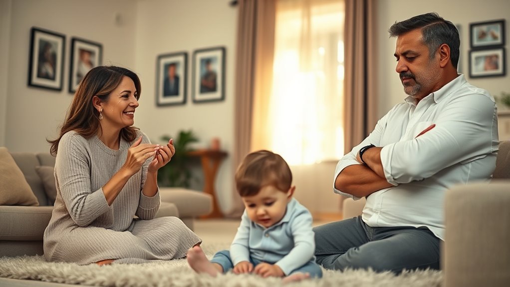 When parents disagree, it’s important to present a united front for your child’s stability. Communicate openly and calmly about your perspectives beforehand, so you stay consistent in front of your kids. Support each other’s decisions publicly and handle disagreements privately to avoid confusion. Modeling respectful dialogue and teamwork reassures children, helping them feel secure despite disagreements. Maintaining this harmony fosters trust and stability; if you want to learn more about maneuvering conflicts constructively, keep exploring these strategies.