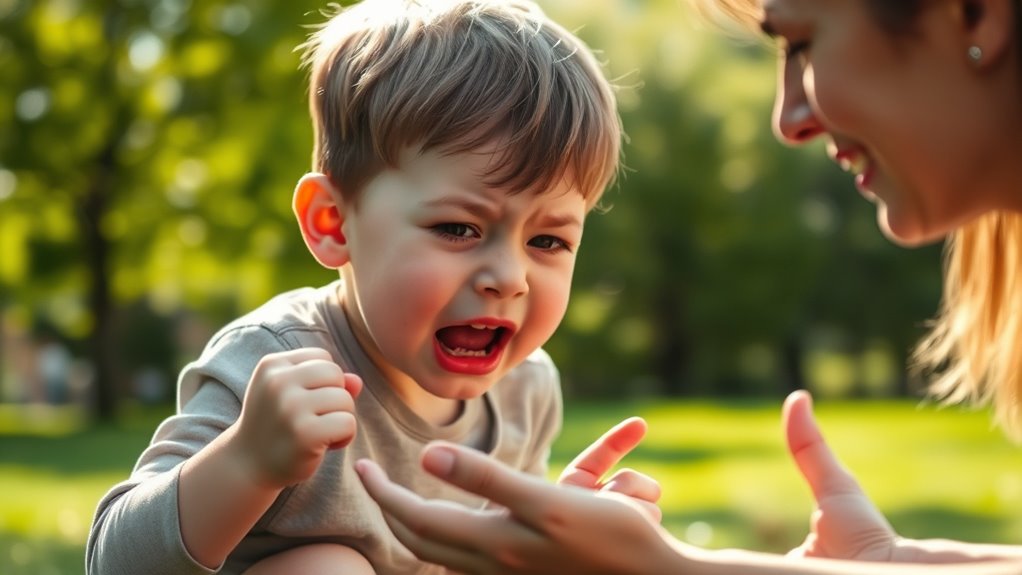 Imagine juggling flaming torches—handling multiple tantrums at once feels similar. You stay calm and focused, providing individual reassurance to each child, while maintaining emotional resilience. Address sibling dynamics by acknowledging their feelings and encouraging empathy. Use quick, soothing techniques like deep breaths or gentle touch. Remember, your calm presence helps them feel safe, and over time, they learn to regulate their emotions even in chaotic moments.
