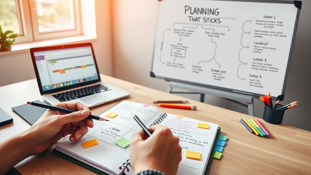 To make planning that sticks, start by setting clear, achievable goals and breaking larger projects into smaller tasks. Use tools like planners or digital calendars to map out your day, assigning specific time slots. Focus on one task at a time and avoid multitasking to stay efficient. Developing a consistent schedule and reviewing your goals regularly help build good habits. Keep exploring further to discover even more effective strategies for strengthening your planning skills.