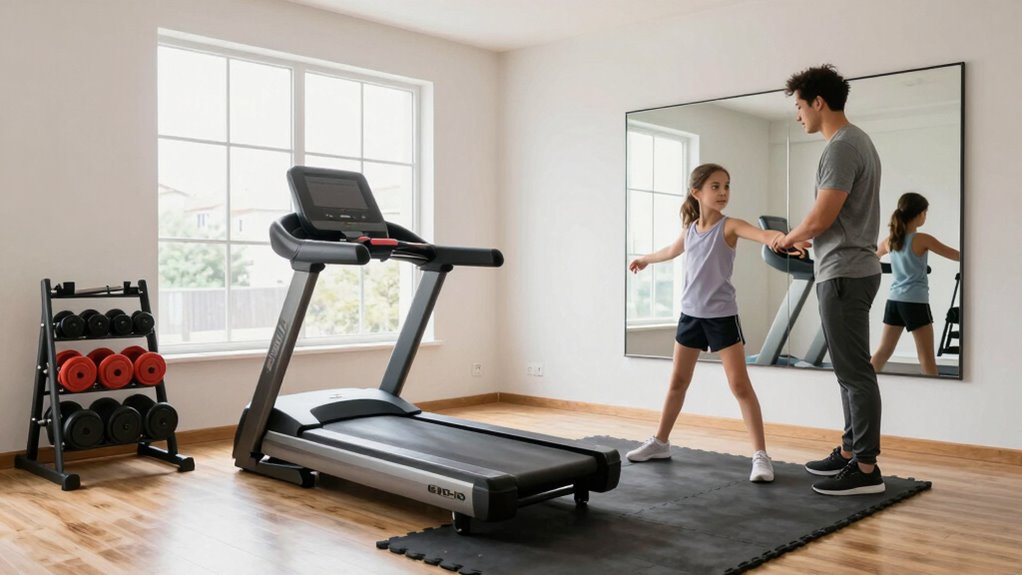 Because safety is crucial, you need to prioritize it when setting up a teen home gym. Proper equipment maintenance is essential to prevent accidents and ensure everything functions correctly. Regularly check weights, machines, and mats for damage or wear, replacing or repairing as needed. This not only keeps the space safe but also boosts your teen’s workout motivation, as they’ll feel more confident and secure during exercise. A well-maintained gym encourages consistency and helps prevent injuries that could sideline their progress. Remember, safety isn’t just about avoiding hazards—it’s about creating an environment where your teen feels motivated and supported to stay active. Prioritizing equipment maintenance demonstrates your commitment to their health and helps foster a positive, safe workout space.