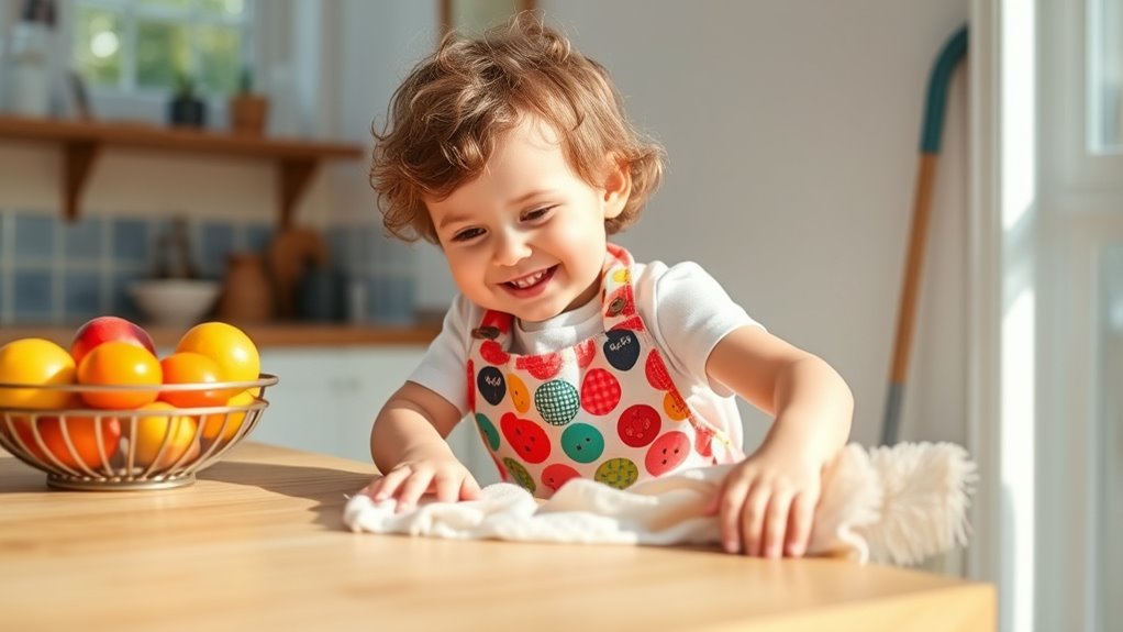 To make chores fun for your toddler, turn them into a game with reward systems like stickers or small treats. Use colorful chore charts to track their progress, giving them a sense of achievement. Celebrate their efforts with praise and encouragement, making chores feel like a rewarding adventure rather than a task. Keeping it playful and positive helps your toddler enjoy helping out and builds good habits early on.