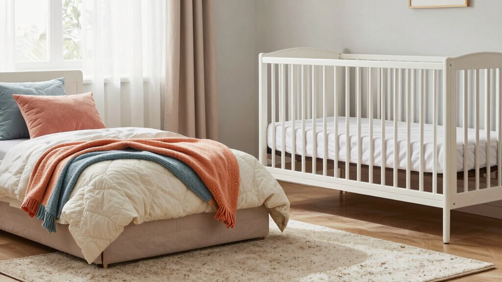 Knowing when to shift your child from a crib to a floor bed depends on their developmental stage and readiness for increased independence. Look for signs like climbing out or showing curiosity about their surroundings. This changeover can also be a great opportunity to update nursery decor, making the space feel inviting and safe. Keep in mind, moving to a floor bed may impact sleep training; your child might take longer to settle or explore their new environment. It’s best to wait until they’re physically and emotionally prepared for the change. A smooth transition involves setting clear boundaries and ensuring the room remains a secure, comforting space. When your child is ready, a floor bed can promote independence while still supporting restful sleep.