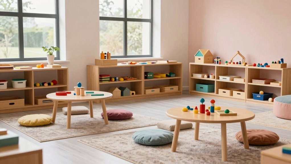 Have you ever noticed how certain colors and lighting can instantly create a sense of calm? Choosing the right soothing paint schemes and pastel color schemes can transform your Montessori playroom into a tranquil space. Soft hues help children feel relaxed and focused, reducing overstimulation. To achieve this, consider using gentle shades like mint green, blush pink, or light blue. Incorporate natural light with sheer curtains to enhance the calming effect. Carefully selected colors foster a peaceful environment where kids can explore and learn comfortably.