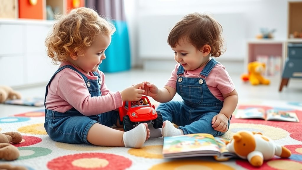 Teaching toddlers about sharing and turn-taking is a gradual process. It’s realistic to celebrate small successes, like taking turns or sharing a toy briefly, rather than expecting perfect behavior right away. Show patience, model calm responses, and reinforce positive actions with praise. Remember, setbacks are normal as they develop these skills over time. If you keep encouraging and guiding gently, you’ll see their confidence grow and more moments of cooperation emerge. Keep exploring for more helpful insights.