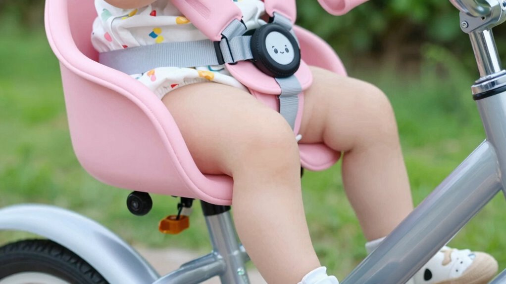 A secure strapping system is essential to keep your toddler safe and stable during bike rides. You want to guarantee harness safety and reliable buckling mechanisms that prevent accidental release. When choosing a bike seat, check for these key features: