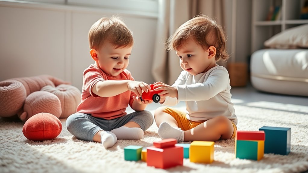 Conflicts between toddlers can feel overwhelming, but they’re natural. You handle these moments with patience and clear sharing strategies, encouraging kids to express feelings and negotiate. Use conflict resolution techniques like guiding them to take turns or share toys, emphasizing cooperation over competition. Remember, your calm approach models respectful behavior, helping toddlers learn essential social skills. With consistent guidance, they’ll develop better ways to navigate disagreements and enjoy their playdates.