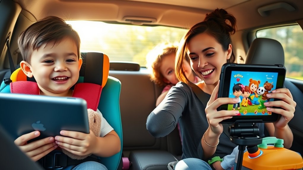 To keep your toddler happy during car rides and flights, pack versatile toys, snacks, and comfort items like blankets. Plan regular stops for stretching and offer engaging activities, like singing or small puzzles, to burn energy and prevent fussiness. Use tech wisely for entertainment and stick to routines as much as possible. Be prepared for surprises with extra plastic bags and a first aid kit. Want more hassle-free tips? Keep exploring to make travel smoother!