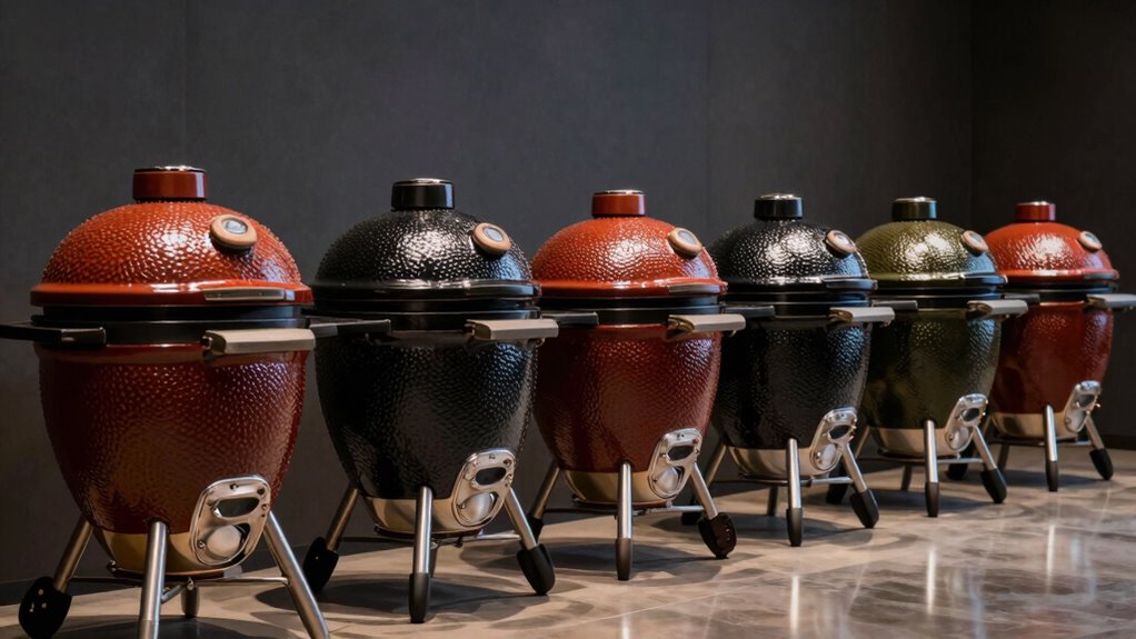 When selecting an 18-inch ceramic kamado grill, size and portability are crucial factors that can make or break your outdoor cooking experience. This size offers a compact footprint that fits well in most outdoor spaces while still delivering a sizable cooking surface. Weighing between 85 and 232 pounds, these grills vary in portability; lighter models with built-in wheels and side handles are easier to move. Features like locking casters and durable handles further simplify relocation, whether for storage or repositioning during a cookout. The overall dimensions, including height and width, determine how comfortably you can transport the grill through doorways or fit into storage areas. Considering these factors ensures your grill is both functional and convenient for your outdoor cooking adventures.