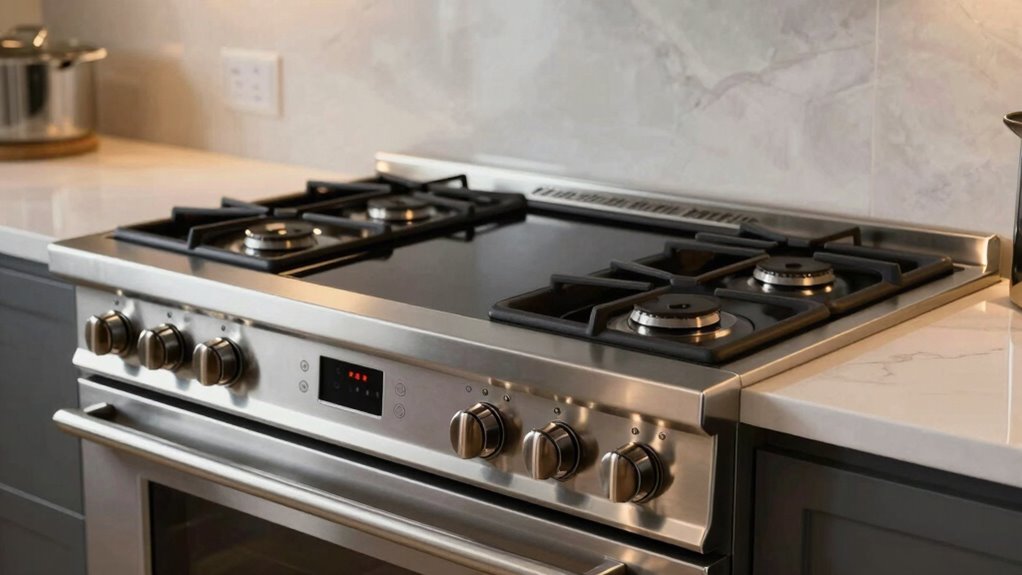 30-inch dual fuel ranges are quite energy-efficient, especially compared to older models. I’ve found that their combination of gas and electric elements allows for precise cooking while using energy wisely. Modern ranges come with features like auto shut-off and better insulation, which help reduce energy waste. Overall, I think they’re a smart choice for anyone wanting effective cooking performance without markedly increasing energy costs.