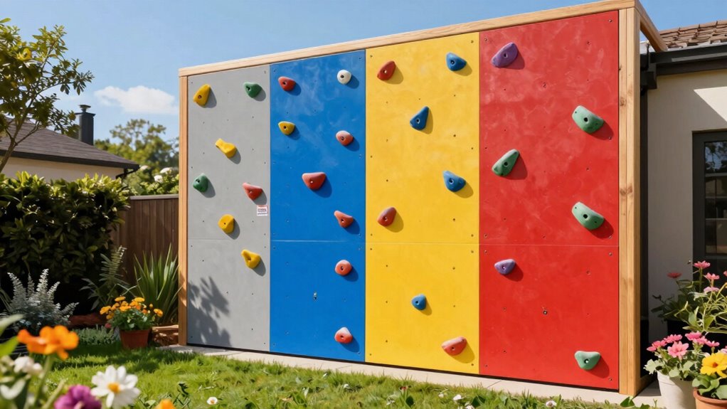 Have you thought about how the colors and designs of a backyard climbing wall can impact both its appearance and your child’s engagement? Choosing a kit with a variety of colors helps match your outdoor decor and creates an inviting, lively environment. Look for options that include multiple shapes and color combinations—these allow you to customize the wall and cater to different skill levels. Pastel, vibrant, or themed color schemes can enhance the aesthetic appeal and stimulate your child’s interest. Guarantee the design features textured grips and ergonomic shapes in various colors to promote safety and build confidence. A mix of colorful holds and accessories not only makes the wall visually appealing but also adds a dynamic element to your backyard, encouraging active play and exploration.