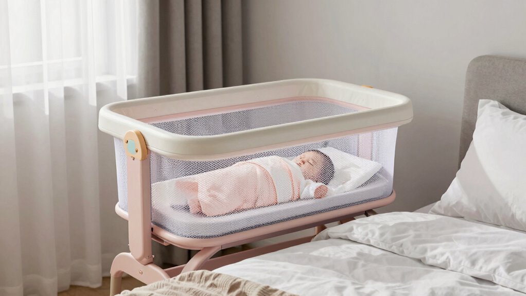 Mobility is a crucial factor to take into account because it determines how easily you can reposition or transport your bedside bassinet in a small space. A bassinet with lockable wheels makes it simple to move between rooms or adjust its position for the perfect proximity to your bed. Lightweight and compact designs mean effortless transportation and storage, which is especially helpful in tight living areas. Swivel or caster wheels with smooth-rolling capabilities allow quick adjustments without disturbing your baby. Additionally, an adjustable height feature can help align the bassinet with different bed heights and room layouts, boosting convenience. Just be sure the wheels have a locking mechanism to ensure stability and safety when the bassinet is in use.