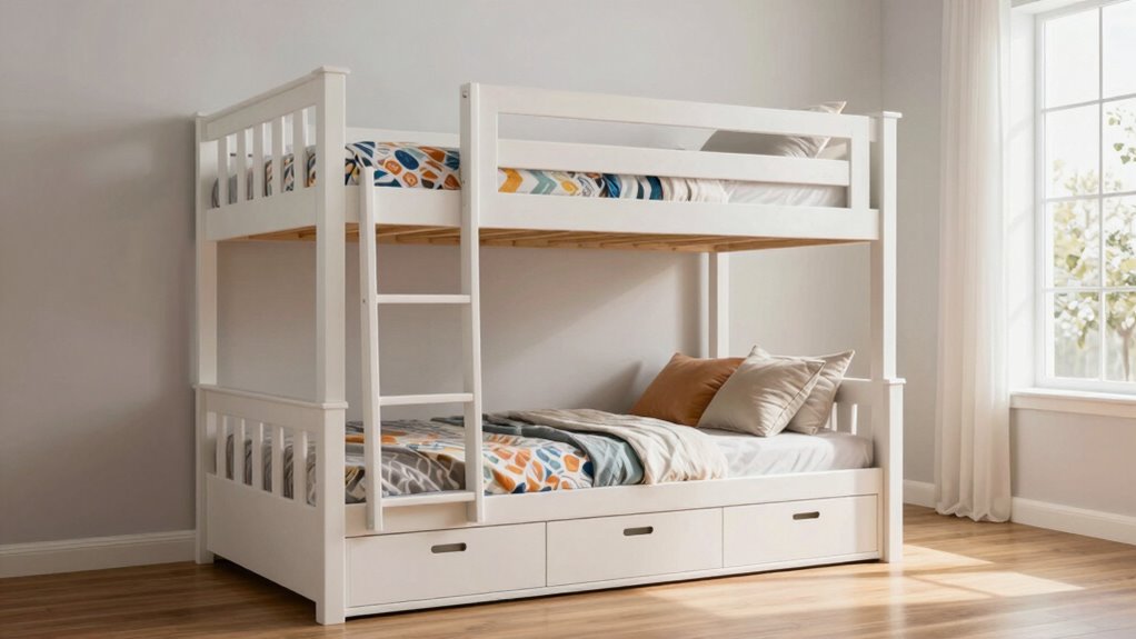 When choosing a bunk bed with storage, I look at how well it fits my space and meets my storage needs. Safety features are also key to guarantee peace of mind, along with durable materials that last. Finally, I consider the design to match the room’s style and how much storage capacity it offers.