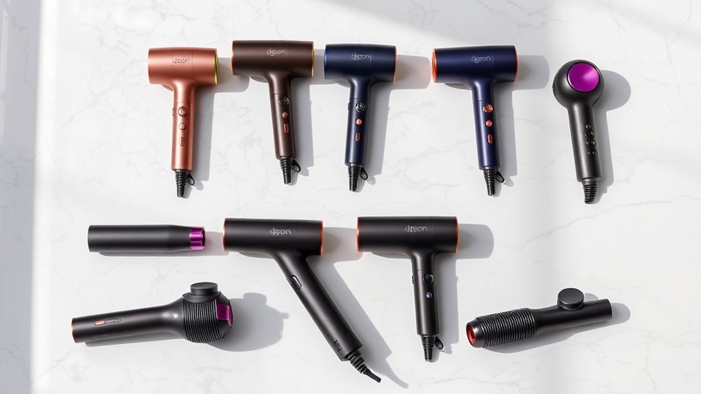 Choosing a Dyson Airwrap alternative that works seamlessly with your existing styling tools can make a big difference in achieving your desired looks. First, confirm the device is compatible with your current attachments or offers similar interchangeable accessories, so you don’t have to switch tools constantly. Look for features like bidirectional curling modes or automatic curling, which add versatility. Check if it supports different hair types and lengths to match the results you get with your Dyson. It’s also helpful if the alternative includes attachments like volumizing brushes, smoothing brushes, or diffusers for a complete styling routine. Ultimately, verify that the device’s heat control maintains safe, low temperatures, protecting your hair’s health while delivering professional results. Compatibility truly makes styling easier and more consistent.