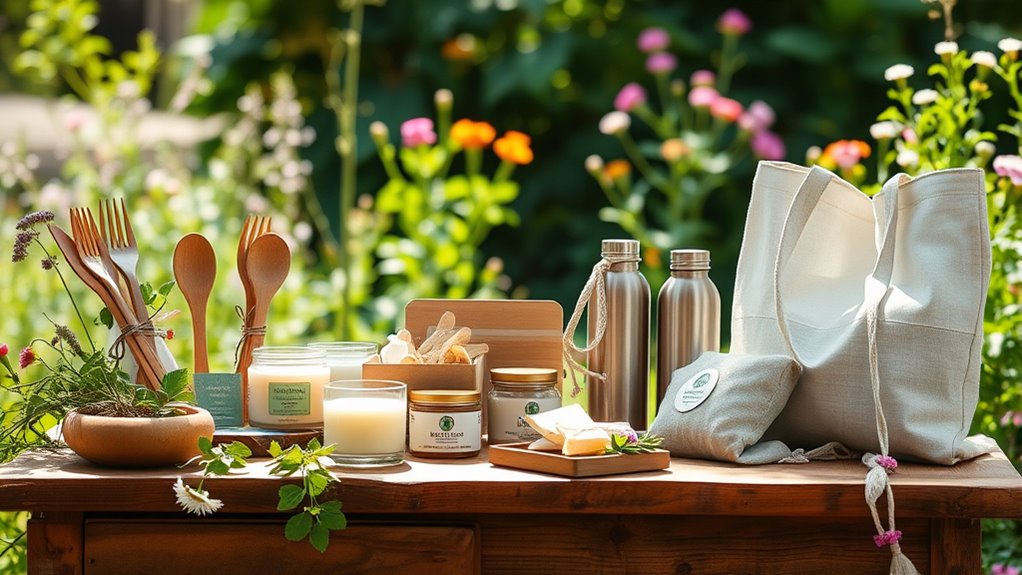 If you’re looking for the best eco-friendly gifts of 2025 that truly make a difference, I’ve got you covered. From handmade lavender candles and eco-friendly ornaments to plantable seed calendars and reusable kitchenware, these gifts emphasize sustainability and craftsmanship. Practical options like travel journals, charcuterie boards, and fun tech accessories also stand out. Keep exploring, and you’ll discover how these thoughtful gifts blend eco-consciousness with style, perfect for any occasion.