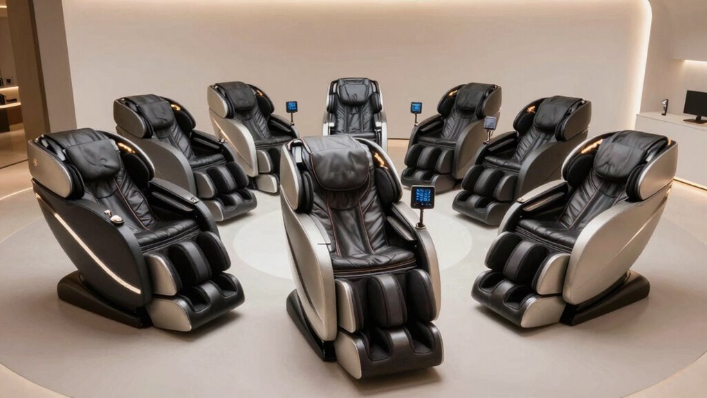 Adjustable zero gravity levels play a vital role in customizing your massage experience. They let you set the recline angle, usually between 100° and 165°, to find your ideal position for relaxation and spinal decompression. Having multiple zero gravity settings helps distribute your body weight evenly, reducing pressure on your spine and boosting circulation during massage sessions. This feature also accommodates different heights and body types, ensuring personalized comfort. Many chairs offer motorized controls, allowing seamless adjustments with just the push of a button. Properly setting the zero gravity position can enhance the massage’s effectiveness by aligning your body to target specific areas and promoting overall relaxation. It’s an essential factor for anyone seeking a truly tailored and effective massage experience.