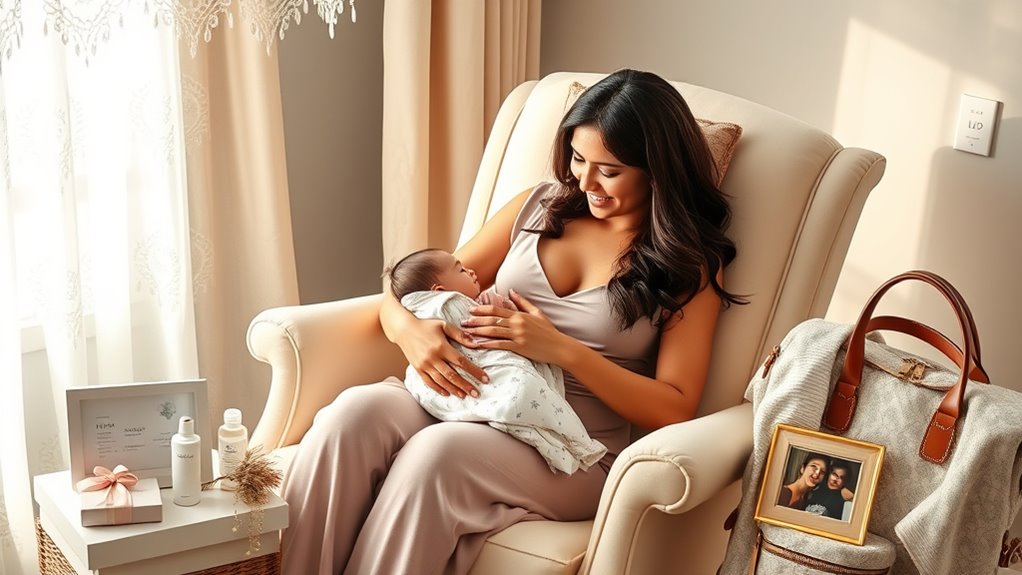 Personalized touches naturally enhance the emotional significance of a gift, but it’s equally important to contemplate the sentimental value that makes it truly memorable. For new moms, items that commemorate milestones—like pregnancy, birth, or first holidays—carry deep emotional meaning. These gifts serve as tangible reminders of special moments, strengthening emotional bonds and celebrating her journey into motherhood. Thoughtful keepsakes, such as ornaments or figurines, become cherished family heirlooms, connecting her to her child for years to come. Choosing gifts that evoke memories or symbolize her new role adds a personal touch that resonates long after the moment. Sentimental gifts aren’t just appreciated—they’re treasured, creating lasting emotional connections that make her feel truly valued and understood.