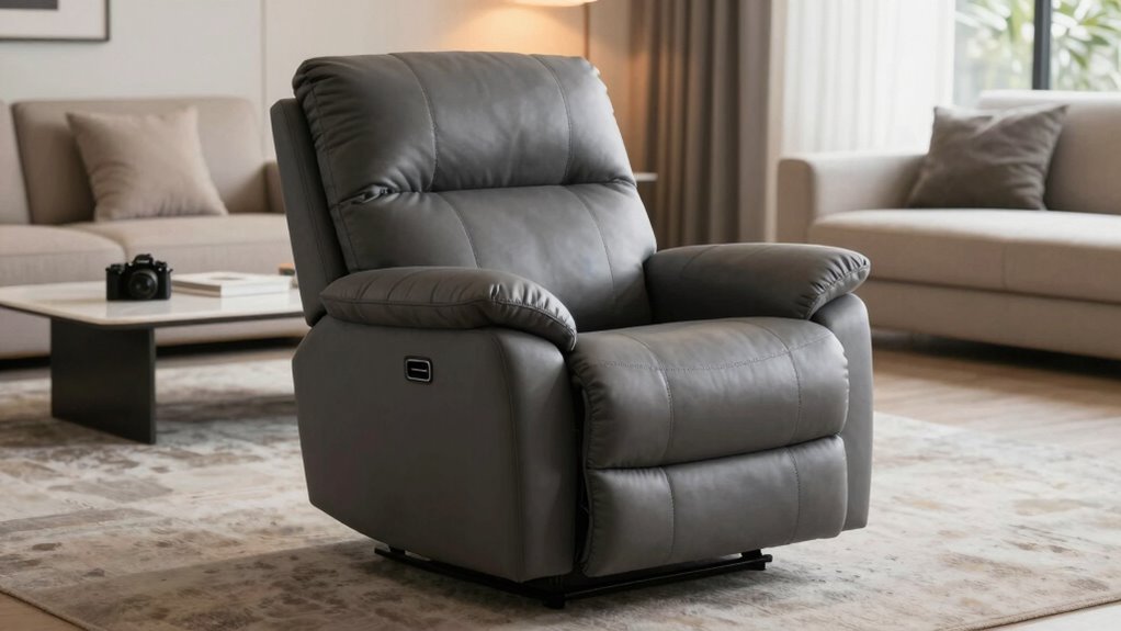 Where you place the USB ports on a glider recliner makes a significant difference in how convenient and comfortable device charging feels during use. Ports on the armrest are easily accessible, making it simple to plug in your devices without interrupting your relaxation. Side-mounted USB ports offer quick access, perfect if you frequently charge devices while seated, but they might be more visible and less discreet. Under-seat or hidden ports help maintain a sleek look but can be less convenient if you need quick access. It’s important to choose a placement that aligns with your habits—whether you prefer charging within arm’s reach or keeping cables out of sight. Also, verify the ports’ location doesn’t interfere with the recline or swivel functions for a safe, comfortable experience.