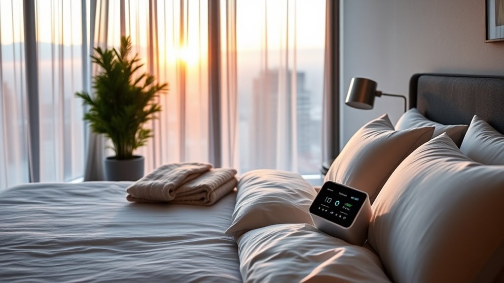 Imagine a gentle breeze whispering lullabies—that’s how eco-friendly sleep devices make me feel. Yes, there are options that prioritize energy efficiency and sustainability. I’ve found that many use low-power modes, solar charging, or biodegradable materials, helping me sleep soundly knowing I’m kind to the planet. These devices are like a calming hug for both my sleep and Earth, offering peace of mind with every restful night.