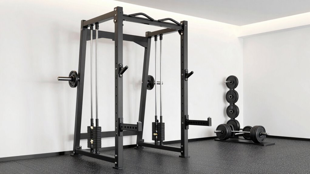 A versatile home gym power rack with cables offers the flexibility to perform a wide variety of exercises, making your workouts more effective and efficient. With adjustable pulley systems at multiple heights, you can target different muscle groups and customize routines easily. Attachments like safety bars, dip handles, and landmine attachments expand your options for functional training, strength building, and rehabilitation exercises. These systems support unilateral movements, helping correct muscle imbalances and improve stability. You can seamlessly switch between compound lifts like squats and bench presses, and isolation moves such as cable crossovers and rows. This all-in-one setup maximizes workout variety without needing additional equipment, making it ideal for all-encompassing training at home. It truly transforms your space into a versatile fitness station.