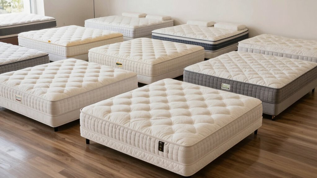 Ensuring your hybrid mattress is safe involves more than just comfort and support—it requires verifying its material certifications. I look for mattresses certified by CertiPUR-US to ensure the foam is free from harmful chemicals, heavy metals, and formaldehyde. OEKO-TEX Standard 100 certification gives me confidence that textiles and fabrics meet strict safety and environmental standards. I also check that components are fiberglass-free, which is especially important for pregnant women and children, to prevent potential health risks. Additionally, I prioritize mattresses that comply with fire safety standards without chemical retardants, often indicated by specific labels. Independent safety certifications reassure me that all materials and manufacturing processes adhere to recognized health and environmental benchmarks, making my sleep environment safer and more trustworthy.