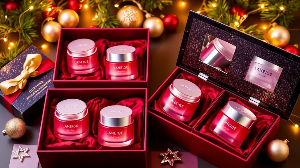 Opting for a Laneige Lip Mask holiday set with appealing gift-wrapping options can make your present stand out. I look for sets that include decorative or customizable wrapping, adding a personal touch. Eco-friendly packaging is also important to me, so I check if the set uses recyclable materials. The design should match the holiday theme, boosting the festive feel. If gift-wrapping services are available at checkout, I save time and effort, ensuring a polished presentation. Additionally, I verify if the set comes with a gift box, pouch, or wrapping paper that guarantees the product arrives beautifully presented. These factors help create a memorable, thoughtful gift that’s both stylish and sustainable, making the holiday giving experience even more special.