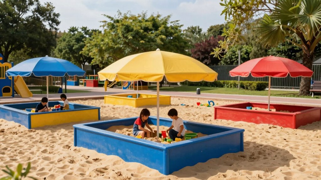 I find that common safety features in large sandbox canopies include UV-resistant fabrics to protect kids from harmful sun rays, sturdy mesh sides for ventilation while keeping debris out, and secure anchoring systems to prevent tipping or blowing away. Many also have smooth, rounded edges to prevent injuries, and some include zippered covers for added protection when the sandbox isn’t in use. These features help keep children safe and comfortable while playing.