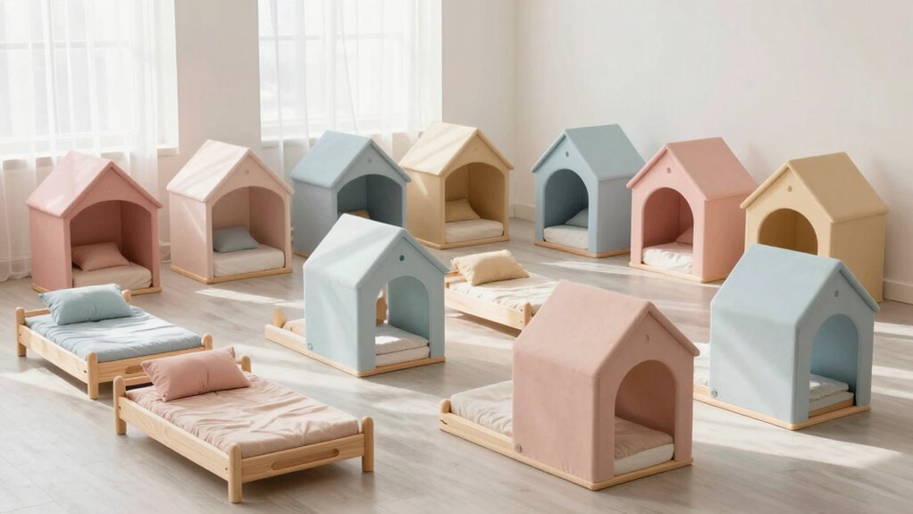 These beds are like tiny castles, perfect for small or shared spaces. I find they fit comfortably without overwhelming a room, making them ideal for cozy bedrooms or shared kids’ rooms. Their compact design helps maximize space, giving your little one a special spot to sleep and play without cluttering the area. If space is limited, these Montessori floor beds are a smart, charming choice.