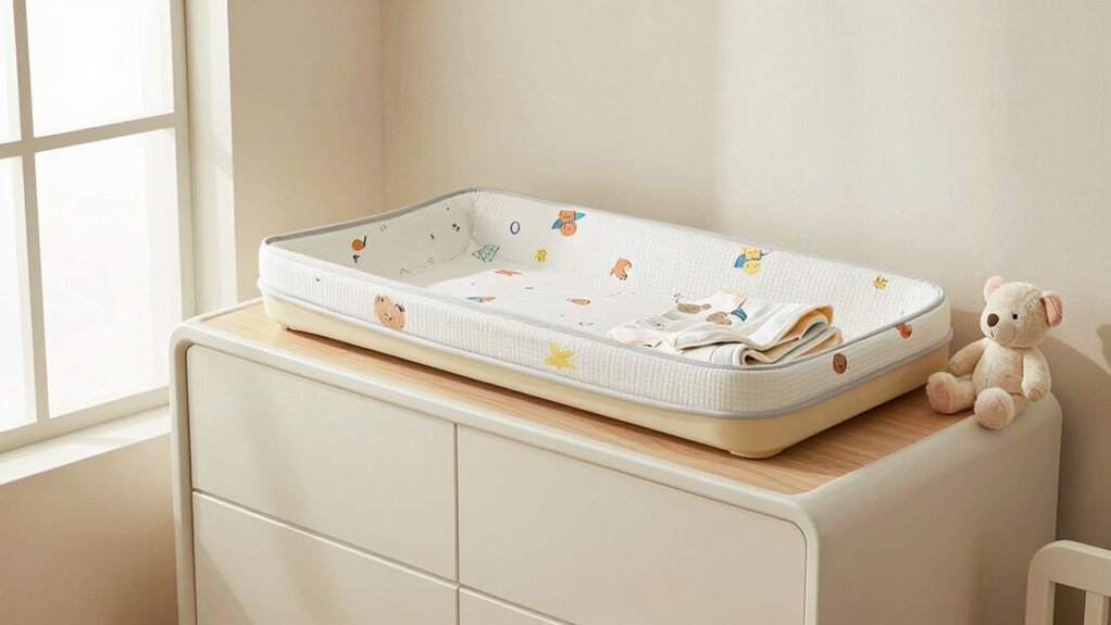 I believe safety features are essential for nursery dressers with changing tables. I look for sturdy, non-tip furniture with anti-tip straps to prevent accidents. I also prefer dressers with rounded edges to avoid injuries, and safety locks on drawers to keep curious little hands out. Additionally, a stable changing pad with high sides helps keep my baby secure during diaper changes. These features give me peace of mind knowing my baby stays safe.