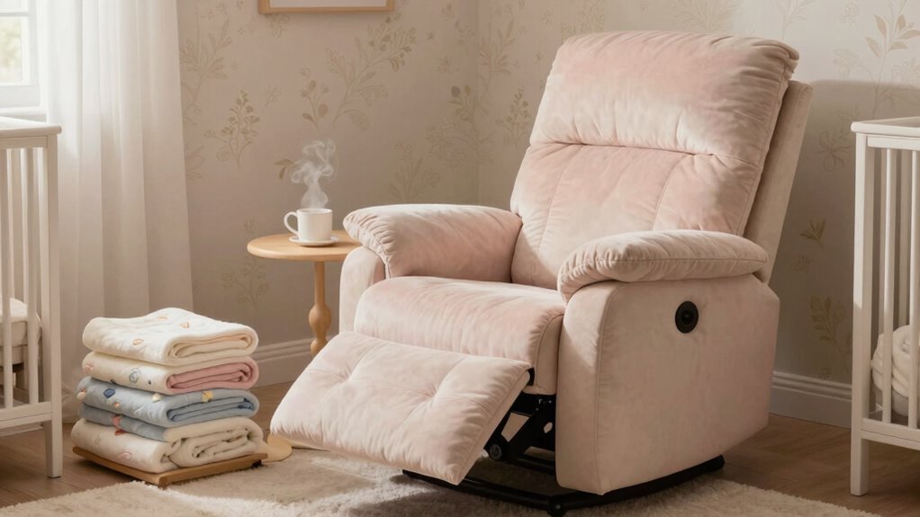 Think of your nursery recliner as a garden that needs regular tending. I recommend vacuuming the fabric weekly to remove dust and crumbs, spot-cleaning stains immediately with mild soap, and avoiding harsh chemicals. Pinpoint any squeaks or loose screws early and tighten them. Cover your chair with washable slipcovers for extra protection. With consistent care, your recliner will stay cozy and beautiful, ready for many more cuddles ahead.
