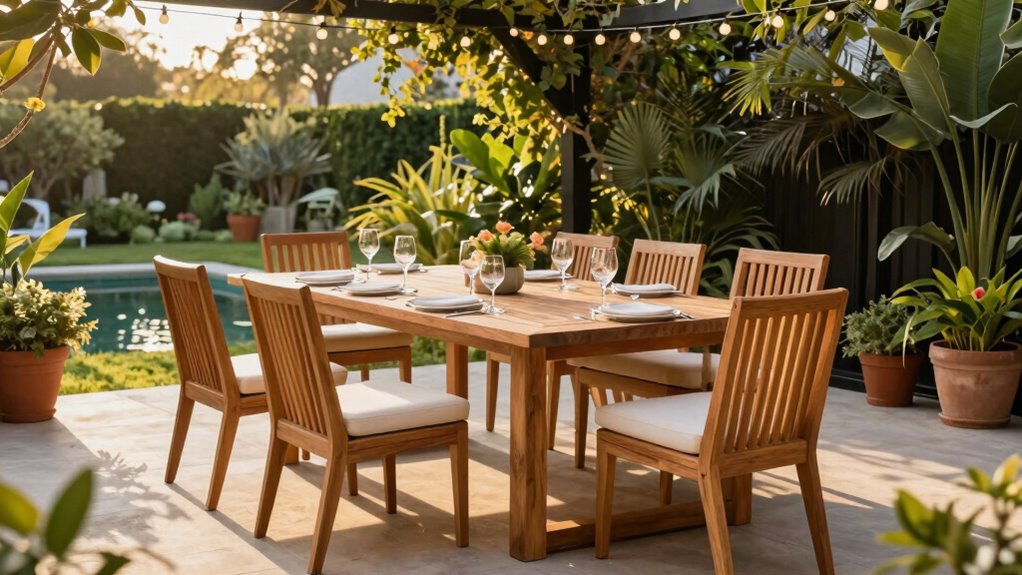 Choosing an outdoor dining set that can withstand the elements starts with understanding material durability and resistance. I look for materials like aluminum, HDPE, or powder-coated steel, as they’re highly resistant to rust, corrosion, and weather damage, ensuring longevity. Weather-resistant finishes, such as UV-protective coatings and waterproof treatments, help prevent fading, cracking, and deterioration from sun, rain, and humidity. I also consider sturdy frames with slatted or textured surfaces that promote water drainage and resist mold or mildew buildup. For natural wood options like teak or acacia, I prioritize those that are naturally moisture and pest resistant, but I know they still need sealing and maintenance. Reinforced joints and corrosion-resistant hardware are essential for maintaining structural integrity over time.